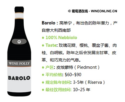 Barolo:Barolo是那种能给你惊喜的葡萄酒。它无论是看起来还是闻起来都让人感觉单薄,偏重花香。但是它的高单宁和高酸度会在品尝时给你的舌头有力一击。